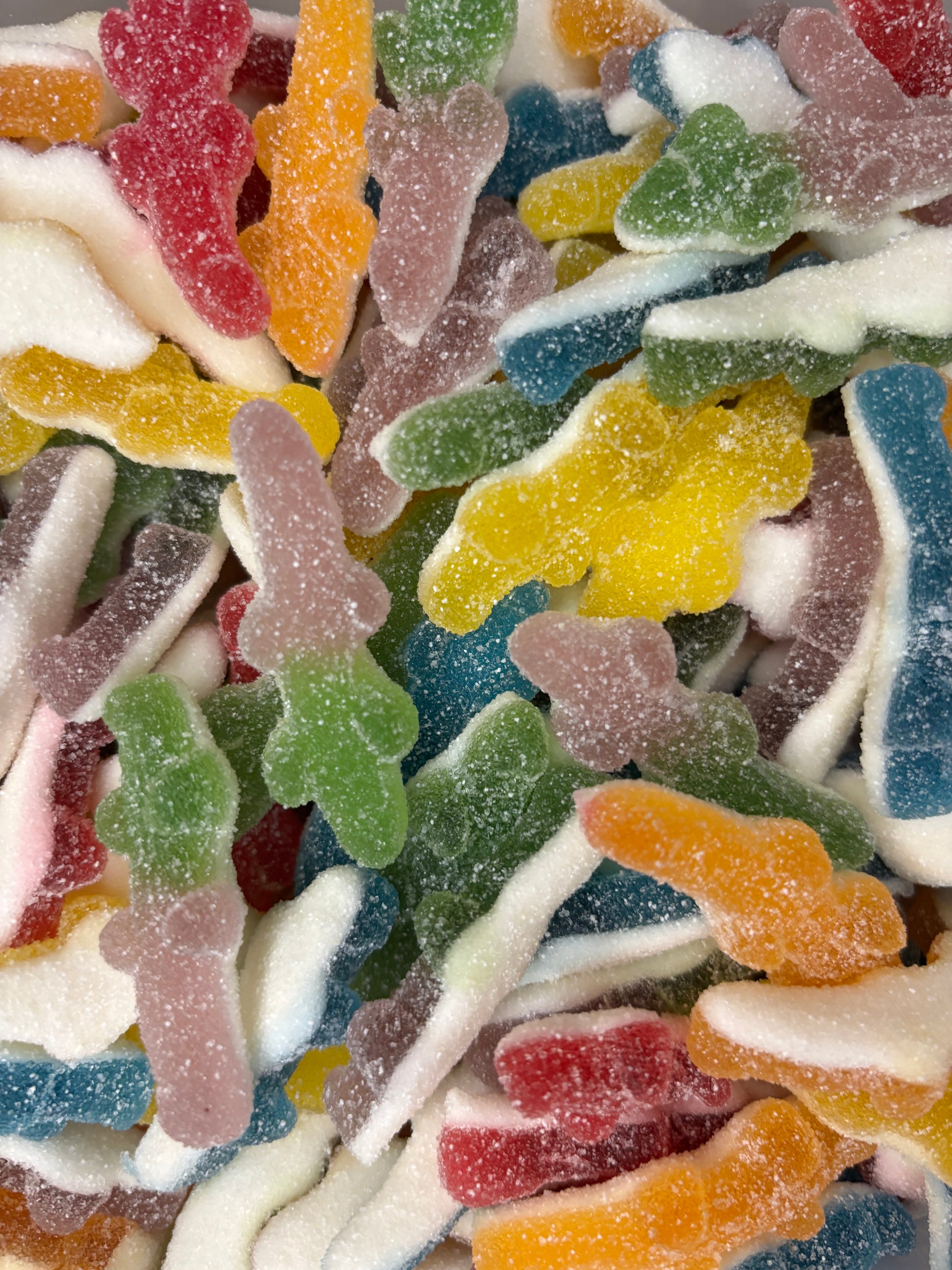 Ingrédients: sirop de glucose, sucre, gélatine, dextrose, acidifiants : acide citrique, acide malique, agent d'enrobage : cire de carnauba, correcteurs d'acidité : citrate de calcium, malates de sodium, arômes, concentrés de fruits et de plantes (citron, carthame), sirop de sucre inverti, colorants : carmins, bleu patenté V, lutéine
