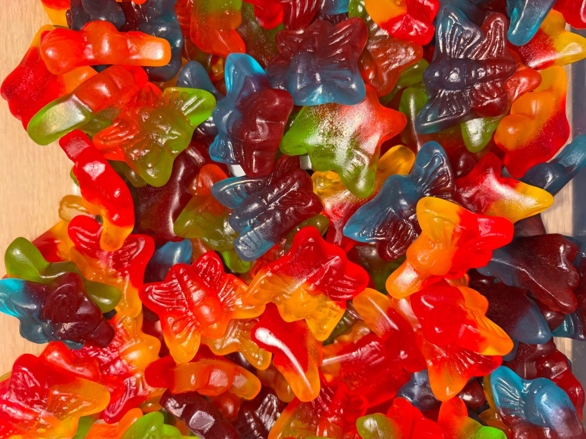 Ingrédients: sirop de glucose, sucre, eau, amidon modifié de pomme de terre, gélatine, acidifiants : E330, E296, E270, arômes, colorants : E102, E104, E110, E124, E129, huile végétale (palme), agent démoulage : cire de carnauba.